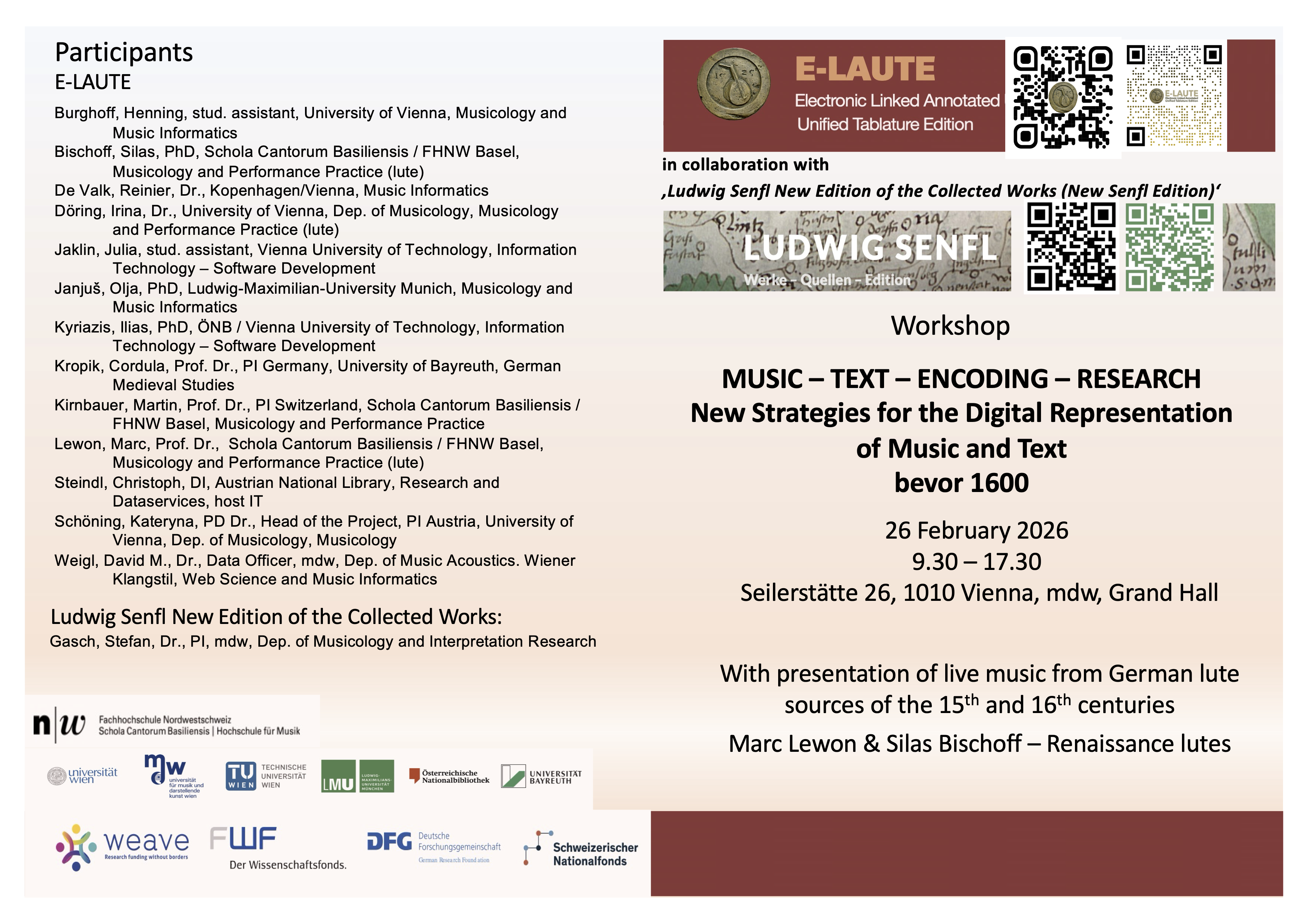 Organised by the E-LAUTE project in collaboration with the Ludwig Senfl New Edition of the Collected Works (New Senfl Edition), the workshop presents the results of the first project phase of E-LAUTE and explores innovative approaches to the digital representation, encoding and scholarly editing of music and text before 1600.